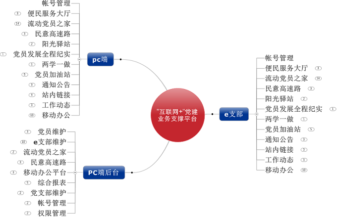 其功能總結如下(xià):賬号管理(lǐ)、便民服務大(dà)廳、流動黨員(yuán)之家、民意高(gāo)速路、陽光(guāng)驿站、黨員(yuán)發展紀實、兩學一做(zuò)、黨員(yuán)加油站、通(tōng)知公告、站内鏈接、工作動态、移動辦公。